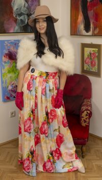 Magasított derekú, hajtásokkal tűzött, lefelé enyhén bővülő, ám a csípő vonalát követő, épp ezért csinos fazonú, hátul cipzárral záródó, elegáns selyem hosszú szoknyánkat az ősz aranyló leveleinek színpompájában, királynői megjelenéssel álmodtuk meg. A derékrész bal elejére hímzett logót varrtunk fel.