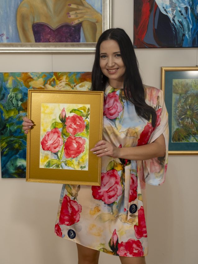 Alkalmi jellegű és extravagánsan nőies megjelenésű, különleges megoldásokkal gazdagított hosszú ruhánk anyaga Színek szerelmese - Havas Csilla - Jázminillat című akvarell alkotásának motívumaival printelve készült.