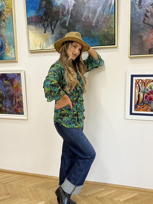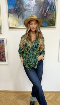 Az Amazonia Blue Camilla blúz a természet, a trópusok mély, vibráló zöldjeit és kékjeit idézi meg – egy könnyed, légies muszlinba zárva. Mintázata Havas Csilla - Trópusi szimfónia című festményének organikus világából született, ahol a levelek és árnyékok tánca a holdfényben az elegancia új értelmezését adja.