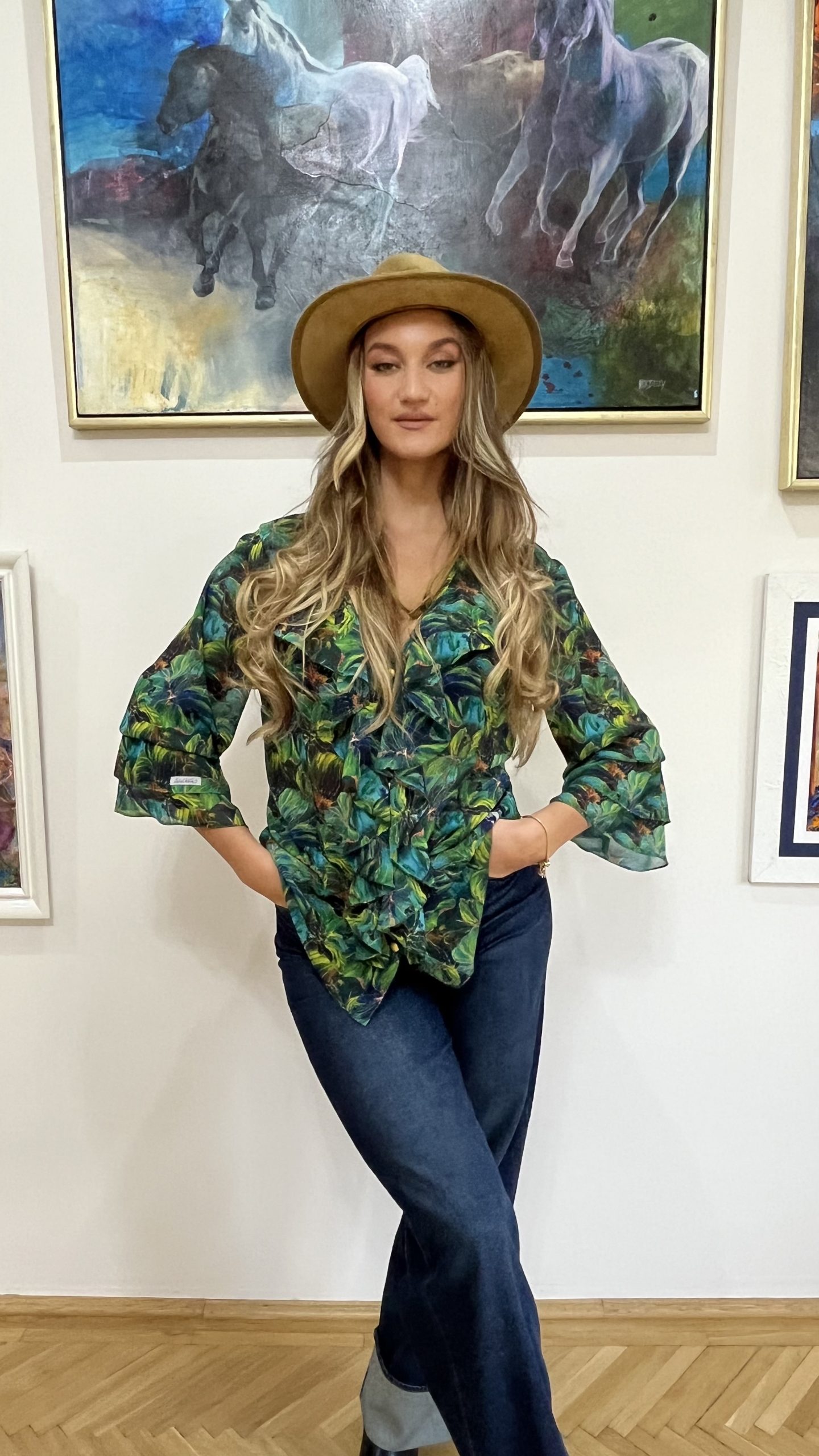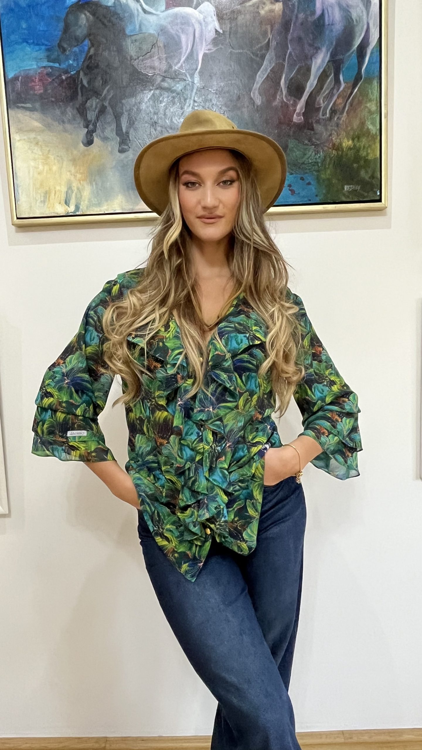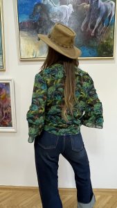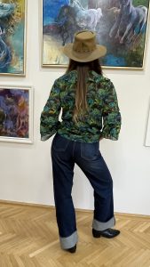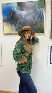 Az Amazonia Blue Camilla blúz a természet, a trópusok mély, vibráló zöldjeit és kékjeit idézi meg – egy könnyed, légies muszlinba zárva. Mintázata Havas Csilla – Trópusi szimfónia című festményének organikus világából született, ahol a levelek és árnyékok tánca a holdfényben az elegancia új értelmezését adja.