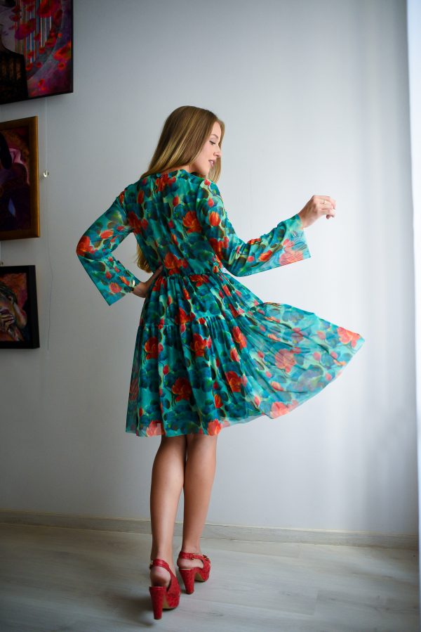 Hosszú ujjú, térdig érő fazonú könnyed ruha, melynek szoknyarésze a derekánál ráncolt, lefelé bővülő és egy fodorral szabott. A teljes szoknyarész bélelt. Felső része enyhén áttetsző, hátul a nyakrésznél anyagával behúzott gombbal záródik. Kerek nyakkivágású, az ujjak lefelé enyhén bővülnek. Jobb oldalt elöl, a derékrésznél és a bal ujja alján LullaCharm címkét varrtunk fel. Opcionálisan LullaCharm hímzett emblémával ellátott rugalmas fekete övvel is viselhető, mely külön rendelhető hozzá.