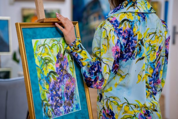 Az anyagra a ‘Kék és lila akácok’ című akvarell technikájú festményem motívumait printeltük.