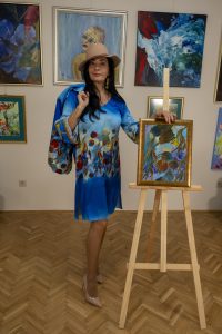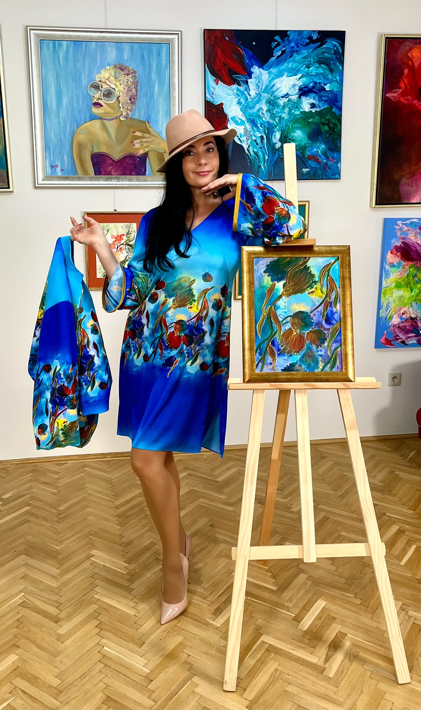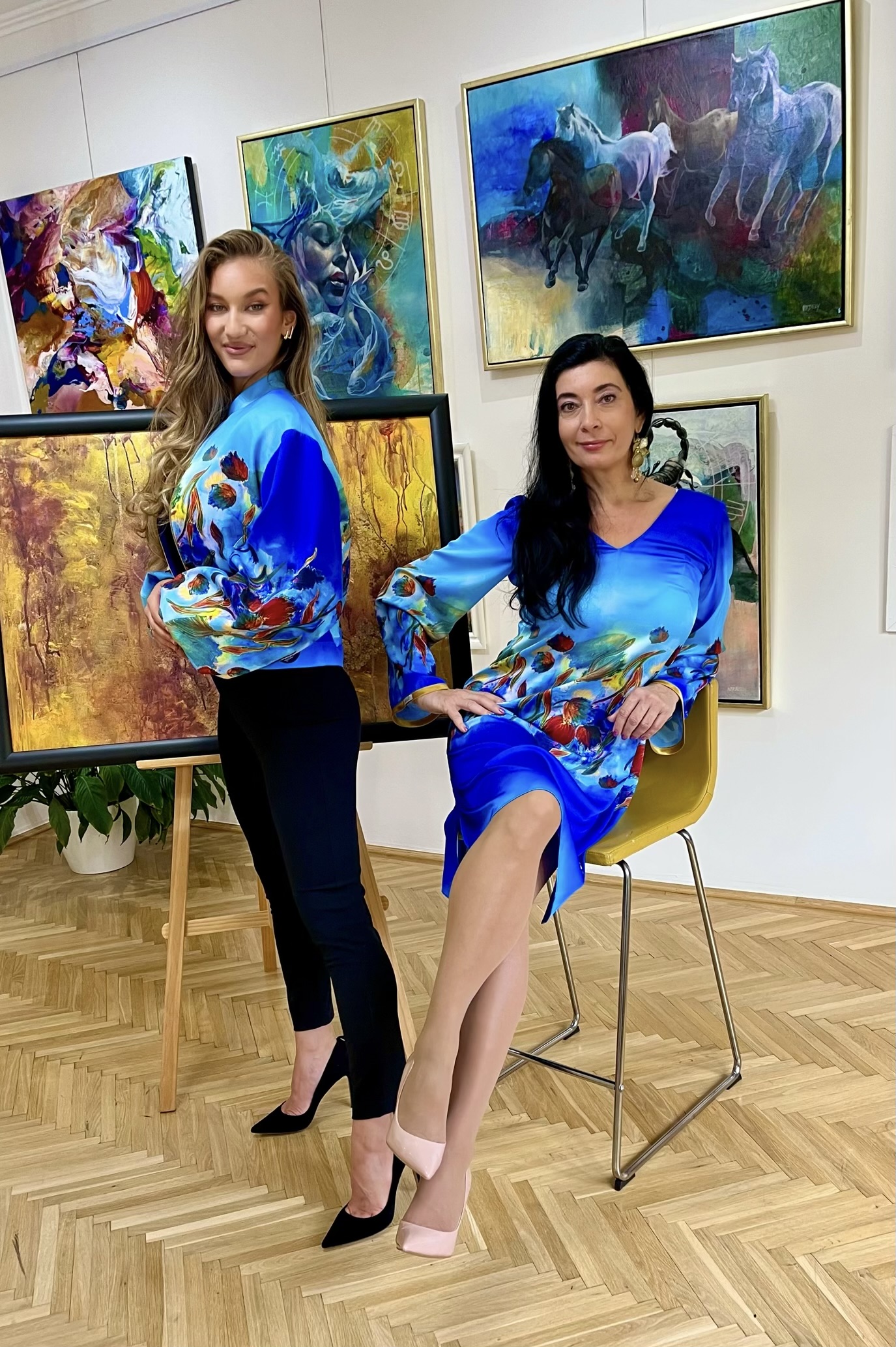 Különleges és egyedi mintája és ősziesen ragyogó színvilága Színek szerelmese – Havas Csilla – Őszi szimfónia című olaj, akril technikájú festményének printelt motívumaiból született meg. Ez a selyemruhánk tökéletes kiegészítője az ugyanezen anyagból készült hosszú szoknya – ujjatlan felső, valamint az ugyanezen mintájú, ám szövet anyagú cipzáras bomber kiskabátnak, mint kollekciós daraboknak.