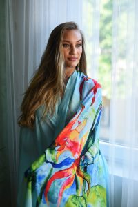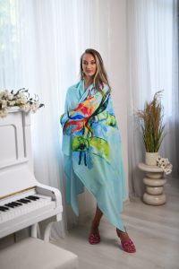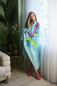 Leírás: Nagy méretű, téglalap alakú többfunkciós vállkendő, melyre a Riviéra kollekciónkban az ‘Adriai papgájok’ című akvarellem motívumait printeltük. A kendő viselhető stólaként, vállkendőként, illetve mérete okán strandkendőként egyaránt. A kendő bal felső sarkára hímzett címkét, míg a bal alsó sarkára hímzett logót varrtunk fel.